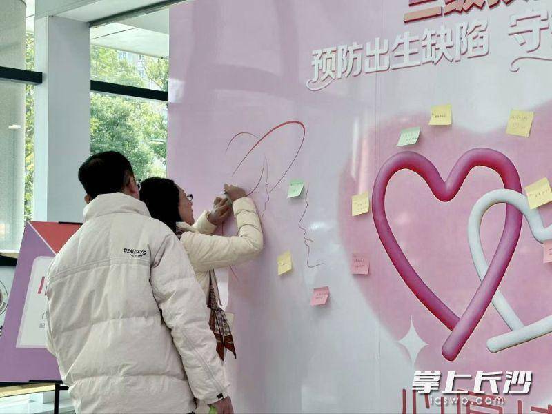 “颖宝,天天开心!爱你!”“祝我们长长久久!”心愿墙上,一张张便签纸写满了备孕家庭对宝宝的美好祝福、准夫妻对小家庭的温馨期许,字里行间洋溢着幸福的憧憬。遗传性罕见病知识答题区,医护人员通过趣味问答的方式,向参与者科普遗传性罕见病的预防、诊断及干预知识,有效增强了大家的健康防护意识。