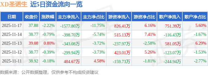 证券之星消息,截至2025年11月17日收盘,XD圣诺生(688117)报收于37.88元,下跌2.22%,换手率2.22%,成交量3.49万手,成交额1.34亿元。