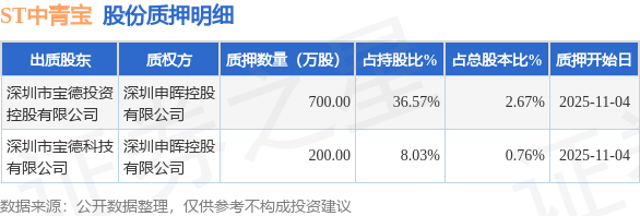 证券之星消息,ST中青宝(300052)11月7日公开信息显示,股东深圳市宝德投资控股有限公司、深圳市宝德科技有限公司向深圳申晖控股有限公司合计质押900.0万股,占总股本3.43%。质押详情见下表:
