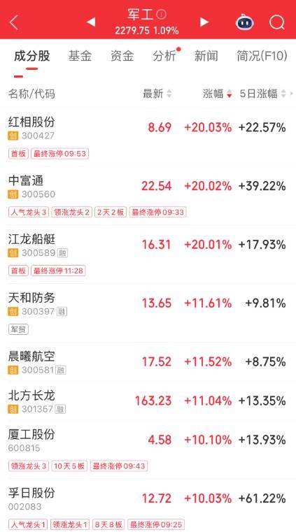 军工板块延续上周强势,航天发展2连板,长城军工涨停,早盘获得主力净流入18.28亿元,位居A股榜首;北方长龙涨超11%,天海防务、国科军工、内蒙一机等涨超5%。
