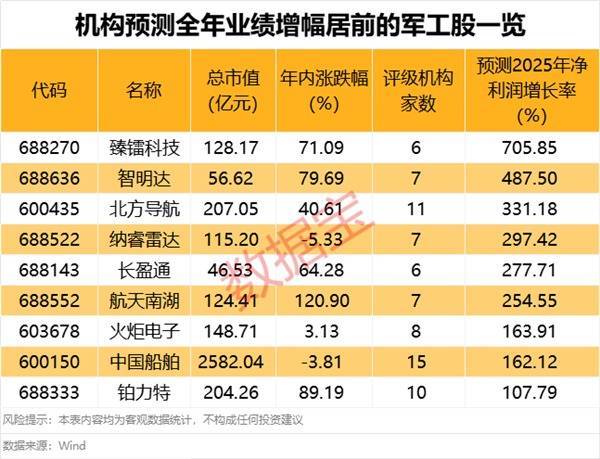 从业绩预期来看,超5家机构给予评级的军工股中,有9只股获得机构一致预测2025年净利润将大幅度增长,增幅均超100%,包含臻镭科技、智明达、北方导航、纳睿雷达等。