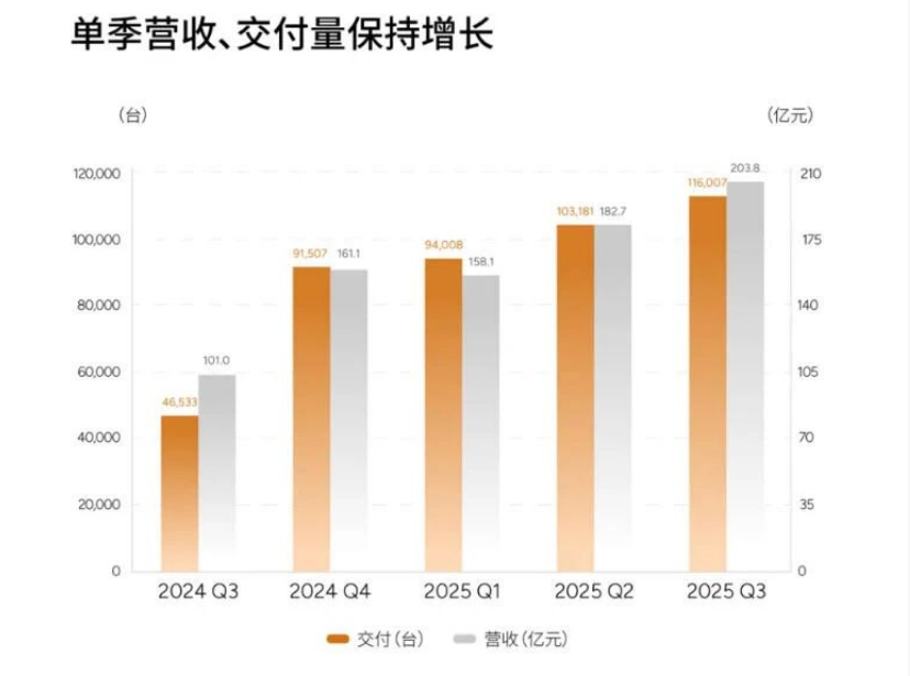 盈利能力改善的背后是交付量的持续攀升。2025年第三季度,小鹏汽车总交付达到116,007台智能电动汽车,同比增长149.3%,环比增长12.4%,创下季度交付量新高。这一增速远超行业平均水平,显示出小鹏汽车在激烈市场竞争中的独特吸引力。