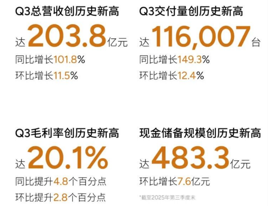 截至2025年9月30日,小鹏汽车现金及现金等价物、受限制现金、短期投资及定期存款达到483.3亿元,创历史新高,较上半年末净增约7.6亿元。充裕的现金储备为小鹏汽车未来的技术研发和市场扩张提供了充足弹药。