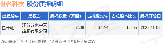 证券之星消息,世名科技(300522)11月7日公开信息显示,股东吕仕铭向江苏苏豪中天控股有限公司合计质押452.0万股,占总股本1.4%。质押详情见下表: