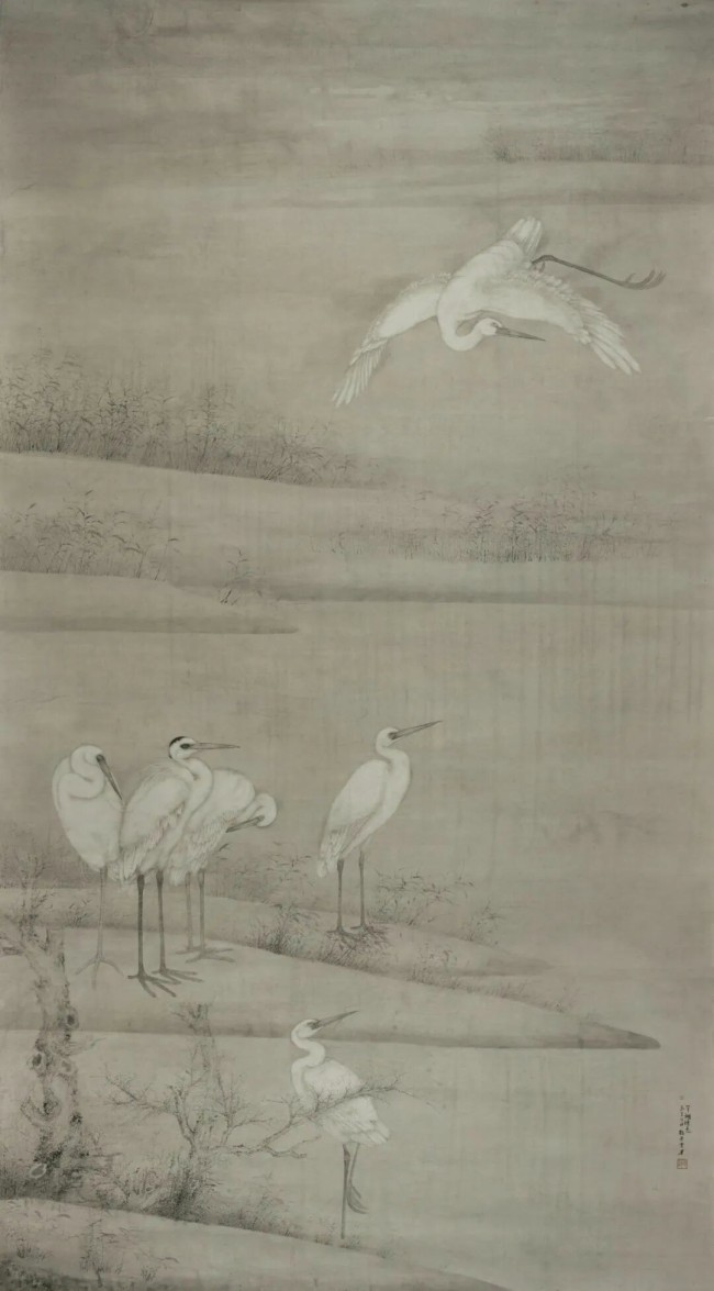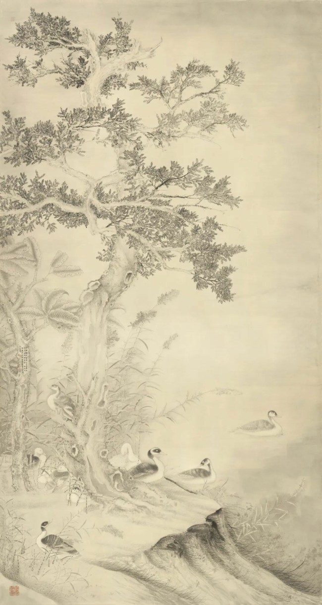 而当传统笔墨遇见时代精神,刘万鸣的创作更显其文化担当与时代回响。他一方面汲取传统滋养创作,另一方面又将现代造型圆融地融入其间,实现“致广大而尽精微”的创造性融合,在禽鸟飞影与山石垂藤间传递着万物和谐的生态哲思。