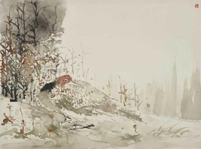 他秉持生活是艺术的源泉,常年深入乡村田野,以画笔反复推敲自然中一草一木的鲜活气息。那些憨态可掬的猪群、灵动矫健的春鸟、静谧沉思的人物,皆源于对生活的赤诚观察。在他眼中,万物皆有灵性,无论是珍禽猛兽还是家禽野草,都能在笔墨中绽放出平等的审美价值。